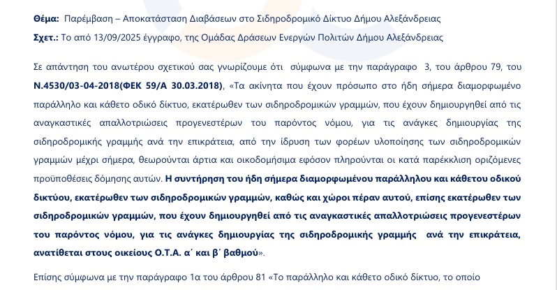Ωστόσο, δεν προκύπτει με σαφήνεια από την ισχύουσα νομοθεσία ποιας βαθμίδας ΟΤΑ (Δήμος ή Αντιπεριφέρεια) έχει την κύρια ευθύνη παρέμβασης και αποκατάστασης στις συγκεκριμένες διαβάσεις του σιδηροδρομικού δικτύου του Δήμου Αλεξάνδρειας.