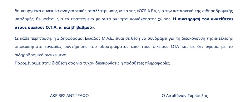 «Η συντήρηση του ήδη σήμερα διαμορφωμένου παράλληλου και κάθετου οδικού δικτύου, εκατέρωθεν των σιδηροδρομικών γραμμών, ανατίθεται στους οικείους Ο.Τ.Α. α΄ και β΄ βαθμού», αναφέρει χαρακτηριστικά το έγγραφο του ΟΣΕ.